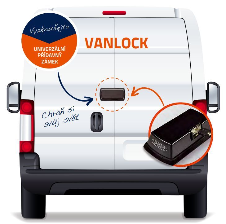 Univerzální přídavný zámek na dveře nákladového prostoru dodávek a užitkových vozidel. Vhodné zejména pro automobily typu VAN, přívěsy, nástavby, karavany a obytné vozy. Lanko nouzového otevření. Krytka proti prachu.