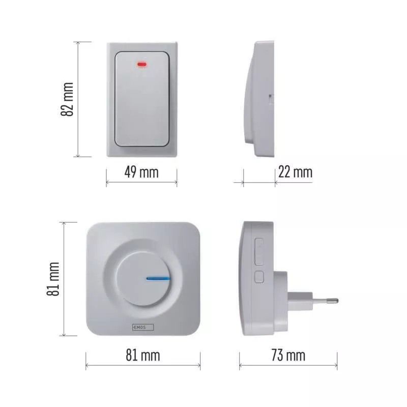Moderní domovní zvonek EMOS v elegantní bílé barvě má zaoblené tvary a na svět svítí dvěma LED diodami, které signalizují jeho bezchybnou funkci. Dioda na tlačítku má barvu červenou, dioda na zvonku pak modrou. Mezi sebou pak obě části soupravy komunikují prostřednictvím rádiových vln o frekvenci 433,92 MHz.