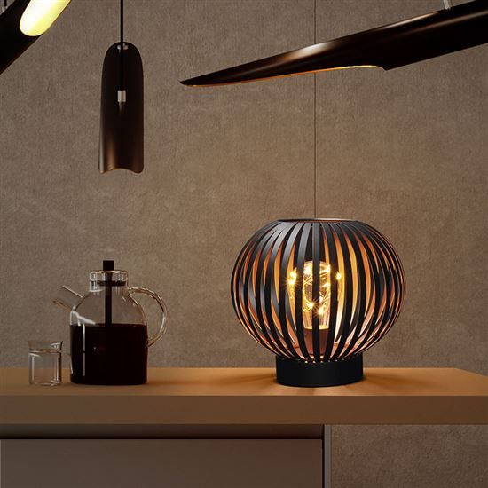 Dekorativní kovová lucerna s žárovkou s micro LED, 10 LED diod. Barva světla: teplá bílá. Režimy: zapnuto / vypnuto. Napájení: 3 x AA baterie (nejsou součástí). Výdrž baterií: cca 100 hodin (v závislosti na kvalitě baterií). Stupeň krytí: IP20 (vnitřní použití). Rozměr: 19 x 16 cm. Materiál: kov, plast. Barva: černá, měděná.