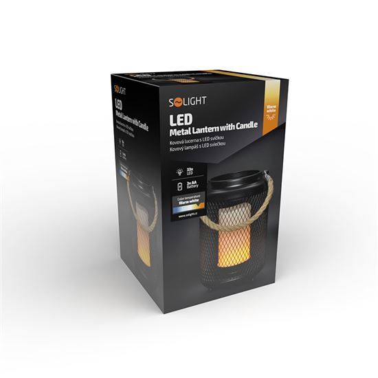 Kovová lucerna s LED svíčkou s mihotavým plamenem. Počet LED diod: 33. Světelný tok: 80 lm. Barva světla: teplá bílá. Režimy: zapnuto / vypnuto. Napájení: 3 x AA baterie (nejsou součástí). Výdrž baterií: cca 100 hodin (v závislosti na kvalitě baterií). Stupeň krytí: IP20 (vnitřní použití). Rozměr: 12 x 20 cm. Materiál: kov, plast. Barva: černá.