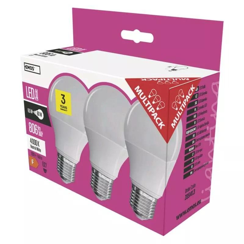 3x LED žárovka Classic A60 8,5W E27 neutrální bílá
