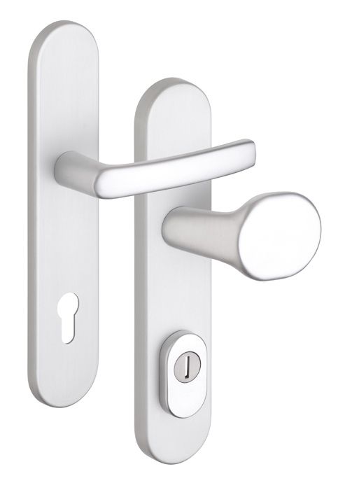 Bezpečnostní kování je dodáváno bez cylindrické vložky a je určeno na vstupní dveře otevírané dovnitř i ven, tloušťka dveří 40-50 mm, dále po 5mm až do tloušťky dveří 100 mm. Kování má ocelovou výztuhu s krycí deskou odolnou proti odvrtání. Kalené čepy ve výztuze. Skryté pevnostní spojovací šrouby. Povrchová úprava: ELOX - přírodní