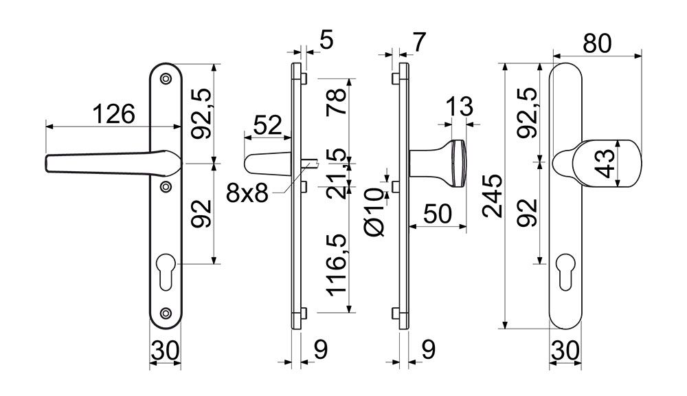 Klika pevně uložena ve štítu. Zakryté šrouby na vnitřním štítu kování. Dodáváno standardně pro tloušťku dveří: 72 – 86 mm - po zkrácení čtyřhranu a šroubů od tloušťky dveří 40 mm Rozteč: 92 mm Balení vč. čtyřhranu 8 x 8 mm, 3 ks spojovacích šroubů M6 x 100 mm a vrtací šablony, 3 ks záslepných krytek na šrouby. Hmotnost netto: RHD.002 - 0,47 kg Povrchová úprava: F9016 – prášková bílá