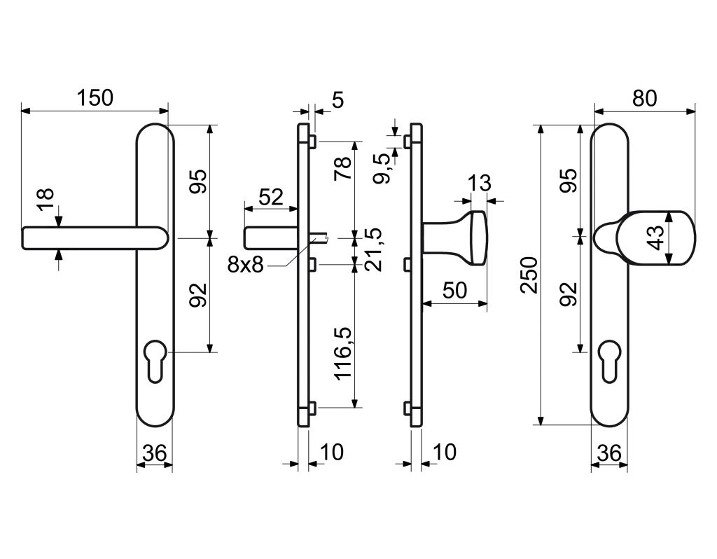 KLIKA PRO PLASTOVÉ DVEŘE - BRONZ Masivní hliníkové kování pro vstupní dveře. Klika pevně uložena ve štítu. Zakryté šrouby na vnitřním štítu kování. Vratný mechanismus kliky tvořený čtyřmi pružinami s hranolkem. Dodáváno standardně pro tloušťku dveří: RHD.0030 72 - 92 mm Po zkrácení šroubů, až pro min. 40 mm. Rozteč: 92 mm Balení vč. čtyřhranu 8 x 8 mm, 3 ks spojovacích šroubů M6 x 100 mm a vrtací šablony. Hmotnost netto: RHD.0030 - 0,81 kg Povrch: F4 - bronzový fluorcarbon