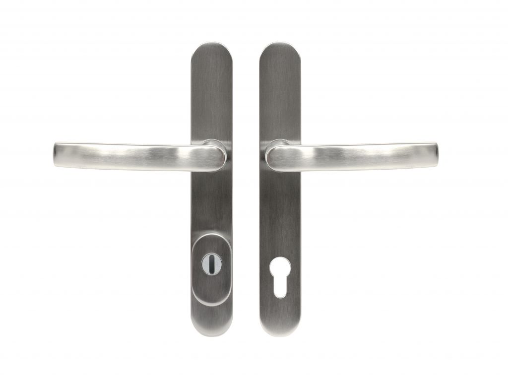 MASIVNÍ NEREZOVÉ BEZPEČNOSTNÍ KOVÁNÍ S PŘEKRYTÍM VLOŽKY PRO VSTUPNÍ DVEŘE Klika pevně uložena ve štítu. Zakryté šrouby na vnitřním štítu kováni. Vratný mechanismus kliky tvořeny čtyřmi pružinami a hranolkem. Dodáváno standardně pro tloušťku dveří: RHD.0040 77-84 mm a 60-64 mm RHD.0041 77-84 mm a 57-64 mm Po zkrácení šroubů 60-84 mm. Rozteč: 92 mm Baleni vč. čtyřhranu 8 x 8 mm, 2 x 3 ks spojovacích šroubů M6 x 90 mm a M6 x 70 mm a vrtací šablony, ………………… Hmotnost netto: RHD.0040 - ……….. kg, RHD.0041 - ……….. kg Povrch: matná nerez (N)