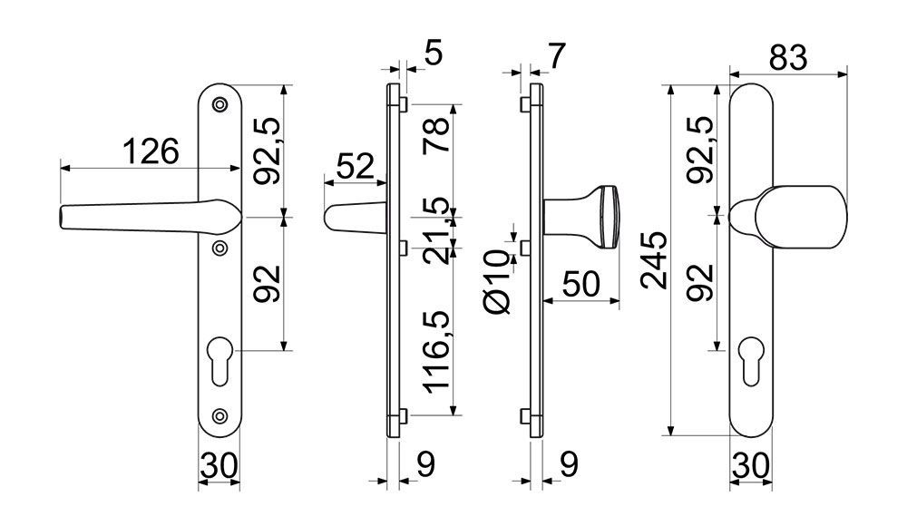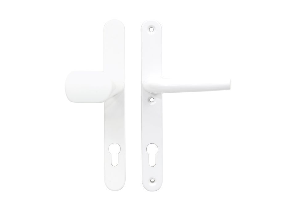 HLINÍKOVÉ KOVÁNÍ PRO VSTUPNÍ DVEŘE Klika pevně uložena ve štítu. Zakryté šrouby na vnitřním štítu kování. Dodáváno standardně pro tloušťku dveří: 72 – 92 mm - po zkrácení čtyřhranu a šroubů od tloušťky dveří 40 mm Rozteč: 92 mm Balení vč. čtyřhranu 8 x 8 mm, 3 ks spojovacích šroubů M6 x 100 mm a vrtací šablony, 3 ks záslepných krytek na šrouby. Hmotnost netto: RHD.005 - 0,53 kg Povrchová úprava: F9016 – prášková bílá
