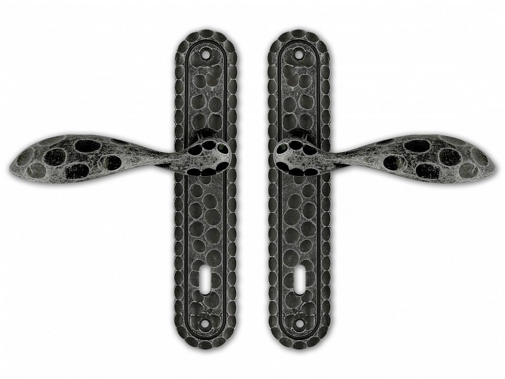 Štítové dveřní kování pro interiérové dveře RUSTIKO kované černé, pro dozický klíč, rozteč 72mm, povrchová úprava zinkoslitina.