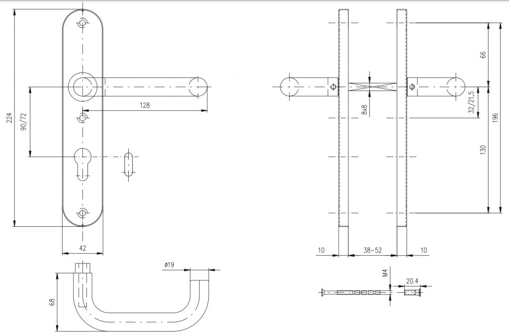 Kování je vhodné na dveře s vyšší frekvenci průchodů. Zkoušeno na 200 000 cyklů. Zesílená konstrukce, pevné spojení klik se štíty a vratné pružiny u obou klik, zajišťují vysokou životnost a odolnost. pro tloušťku dveří 38-52mm