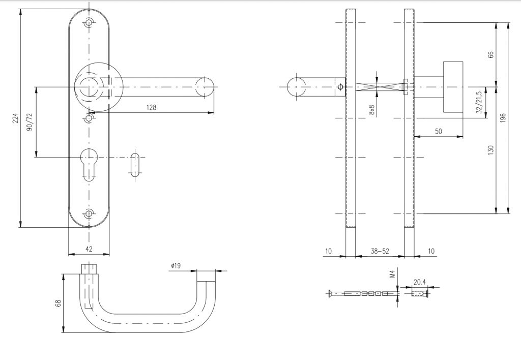 Kování je vhodné na dveře s vyšší frekvenci průchodů. Zkoušeno na 200 000 cyklů. Zesílená konstrukce, pevné spojení klik se štíty a vratné pružiny u obou klik, zajišťují vysokou životnost a odolnost. pro tloušťku dveří 38-52mm