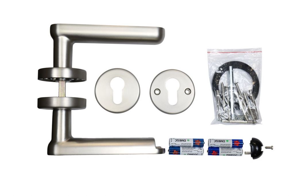 - Balení obsahuje: 1x pár „Smart Touch Handle“, 1x pár rozet pro cylindrickou vložku, 1x pár silikonových podložek pod rozetu kliky, 4x baterie AAA, instalační materiál a šroubovák