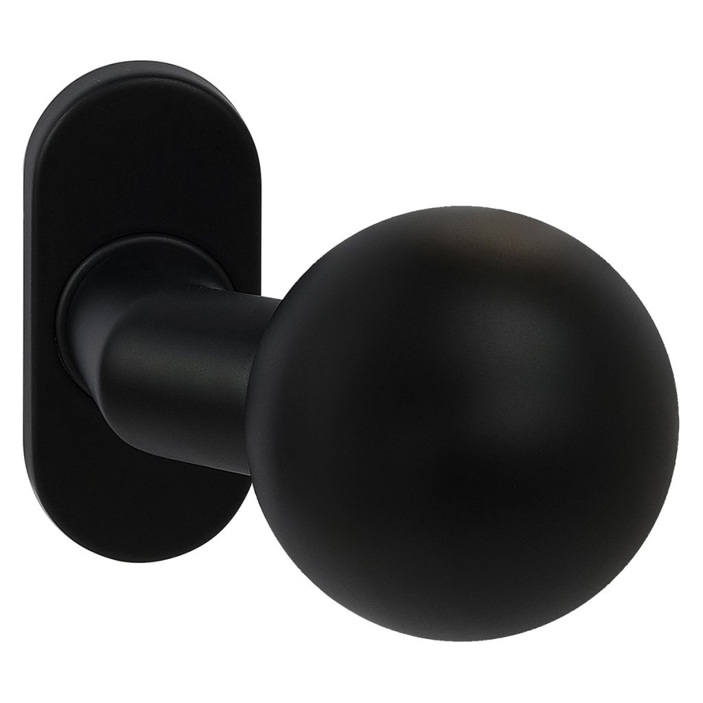 Nerezové kování na oválných rozetách - koule fixní Dodáváno po kuse bez spodních rozet (PZ, BL) Balení vč. spojovacího materiálu a vrtacích šablon Spodní rozety je třeba objednat zvlášť Hmotnost netto: 0,25 kg Povrch: • matná černá (CE)