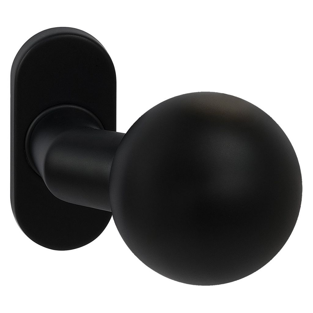 Nerezové kování na oválných rozetách - koule otočná pravá Dodáváno po kuse bez spodních rozet (PZ, BL) Balení vč. spojovacího materiálu a vrtacích šablon Spodní rozety je třeba objednat zvlášť Hmotnost netto: 0,25 kg Povrch: • matná černá (CE)