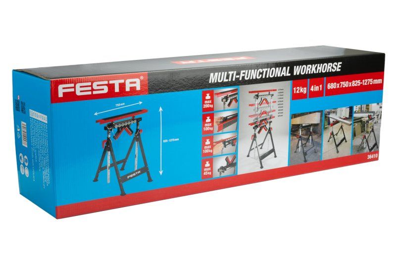 výškově nastvitelná multifunkční pracovní koza / podpěra s otočným systémem nastavení 4 funkcí, NOSNOST max 200 KG otočný systém s čepovou pojistkou lze rychle a bezpečně přestavět na 4 možnosti použití 1. klasická koza s pevným podstavcem s plochým zakončením 8x75 cm a protiskluznou vrstvou 2. koza / podpěra s otáčivými kuličkami - nosnost max. 100 kg 3. rolovací koza / podpěra válcová - nosnost max 100 kg 4. rolovací koza / podpěra s válečky s možností z vodorovné polohy přenastavit do polohy V - pro bezpečnější práci s kulatinou, hranoly a podobnými profily proti sesmeknutí - nosnost max 45 kg nastavitelná pracovní výška 75 - 125 cm ve složeném stavu má koza hloubku jen 15 cm