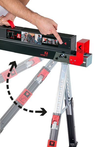 skládací a přenosná koza - podpěra s nosností 590 kg v páru 1180 kg intuitivní postup složení a rozložení, snadná manipulace a kompaktní rozměry po složení - pro přenos nebo převoz masivní celokovová konstrukce - výškově stavitelná v rozsahu 62 - 82 cm po obou stranách nastavitelné koncovky pro uchycení a fixaci dřevěných trámů nebo kovových profilů v rozmezí 4 - 9 cm nosná plocha s protikluznou vrstvou, na jedné straně noh výklopné opěrky pro OSB desky, lamino, apod. s nosností 30 kg na jednu opěrku