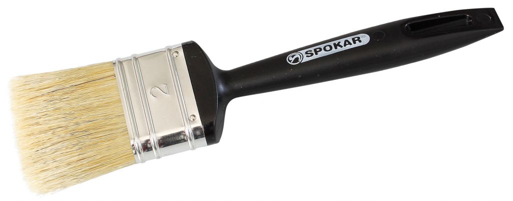 Plastové držadlo pootočené vůči hlavě štětce pro lepší uchopení, zakončení držadla ve formě špachtle - stěrky, čistá štětina. Vhodné pro všechny druhy nátěrových hmot