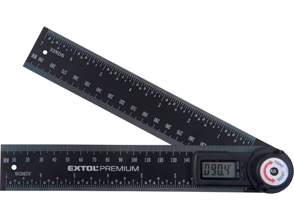 - doplňující parametr: s pravítkem, rozsah měření 0°-360°, přesnost ±0,3°, rozlišení 0,1°, pravítko 400mmx35mm, LCD displej, baterie 3V typ CR2032, možnost zajištění v určitém úhlu, použití k měření úhlů nebo jako pravítko
