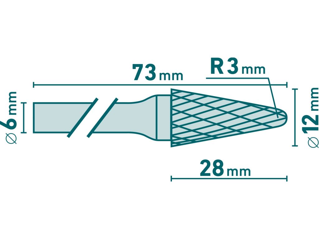 - doplňující parametr: průměr frézy 12mm, délka ostří 28mm, průměr stopky 6mm, celková délka 73mm, materiál wolfram karbid, tvrdost 89-91HRA