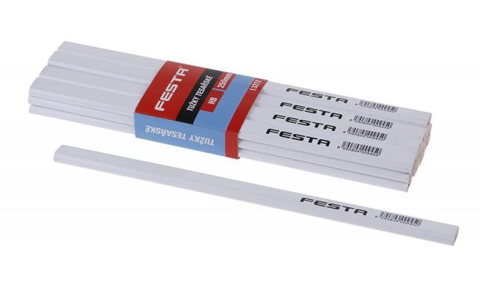 Tužka s klasickou černou tuhou HB - střední tvrdost, nehrocená, použití - dřevo, stavba, bílý lak, ploché tělo, vhodné k reklamnímu potisku.