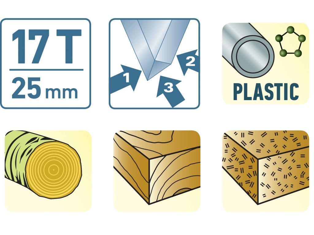 použití na přesné a čisté řezání různých typů dřeva, umělých hmot (např. PVC a ABS trubky) a jim podobným materiálům