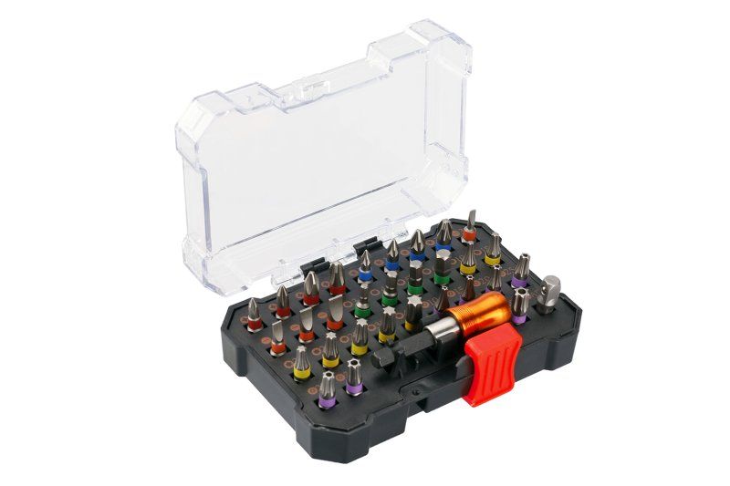 Sada bitů z kvalitní CrV oceli - 32 kusů. Magnetický adaptér 1/4" s pojistným trnem. Dálka bitů 25 mm. Barevné rozlišení dle typu bitu.