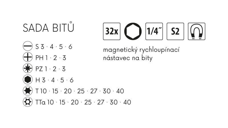 Sada bitů 32ks FESTA, S2 (5036), PH, S, T, Tta, XZN, H + magnetický nástavec.