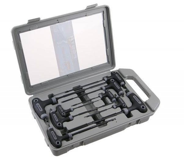 Sada nejpoužívanějších rozměrů L šetihranných klíčů FESTA (imbusů) s plast-pryžovou rukojetí včetně antiskluzového povrchu, CrV, tvrzených v celé délce, baleno v praktickém zavíracím kufříku s průhledem, T10, T15, T20, T25, T27, T30, T40, T45, T50.