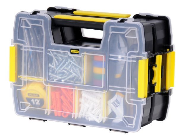 Dvojitý oboustranný organizér STANLEY SORTMASTER: Inovativní uzamykací systém umožňuje připojení a přepravu až tří jednotlivých organizérů. Boční zámky pro bezpečné stohování. Vyjímatelné vložky umožňují kombinované uložení nástrojů a malých dílů. Speciální konstrukce víka udržuje malé části a vložky na místě. Rozměry (ŠxHxD): 290 x 210 x 126 mm.
