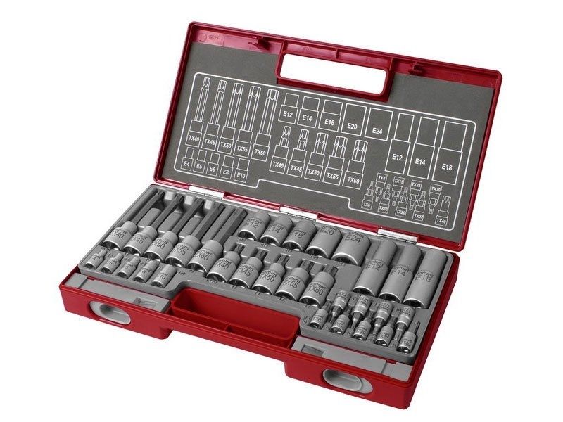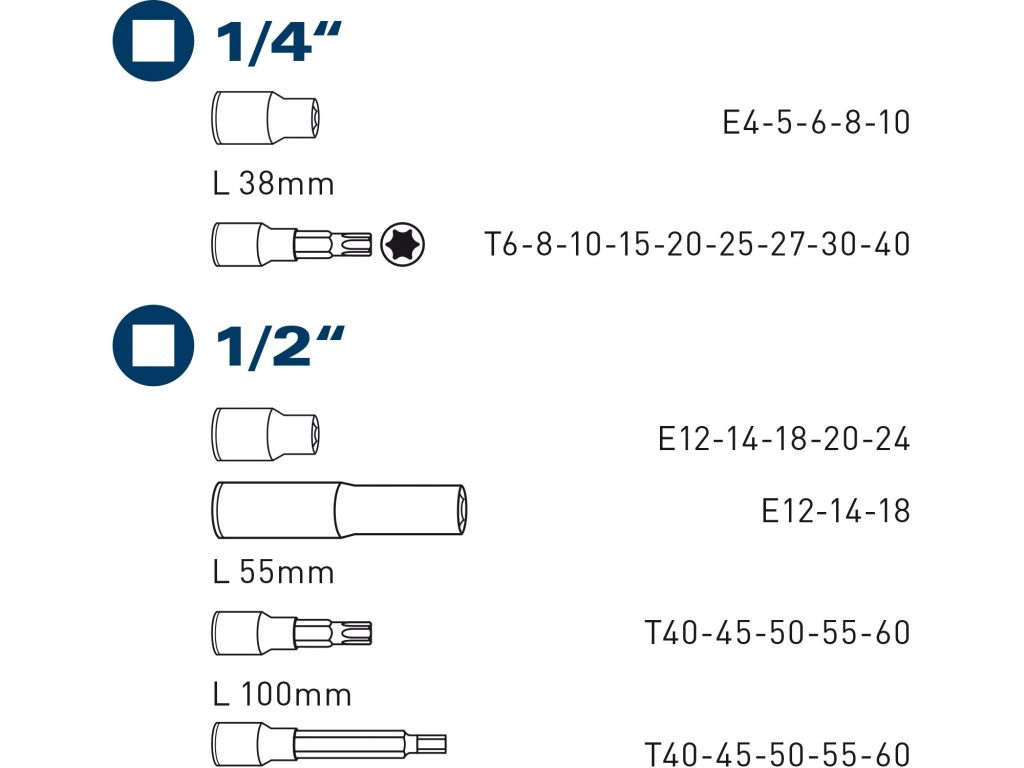 - hlavice nástrčné TORX: 1/4": E4-5-6-8-10, 1/2": E12-14-18-20-24