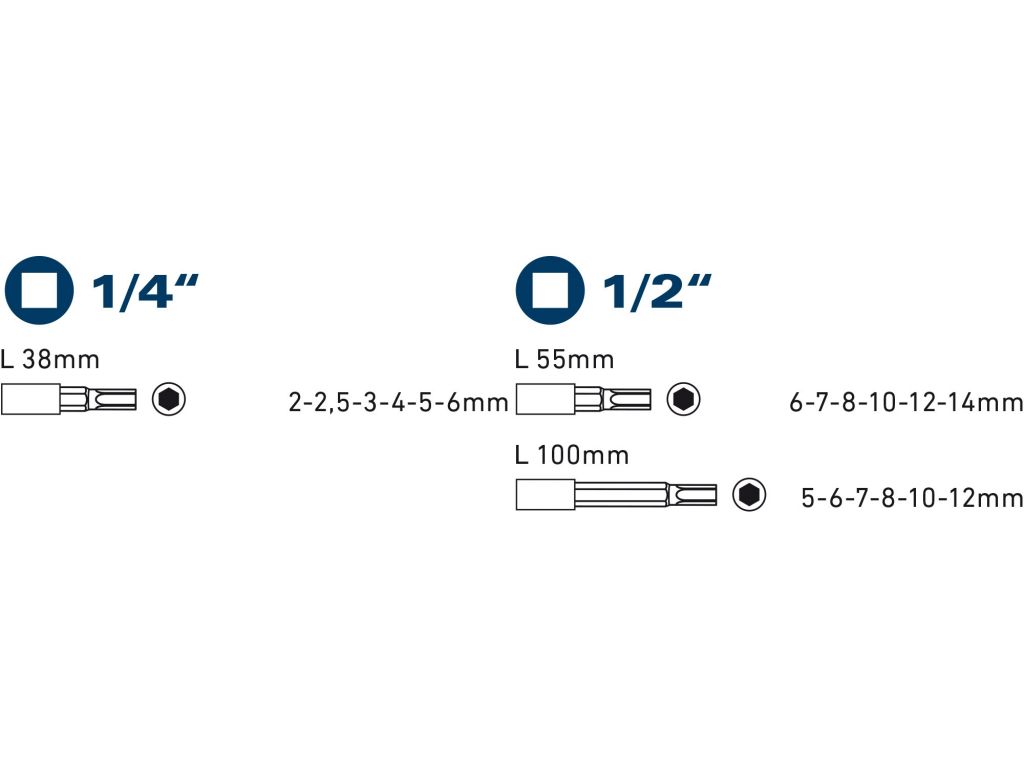 - hlavice zástrčné: 1/4": HEX2-2,5-3-4-5-6mm, 1/2": 6-7-8-10-12-14mm