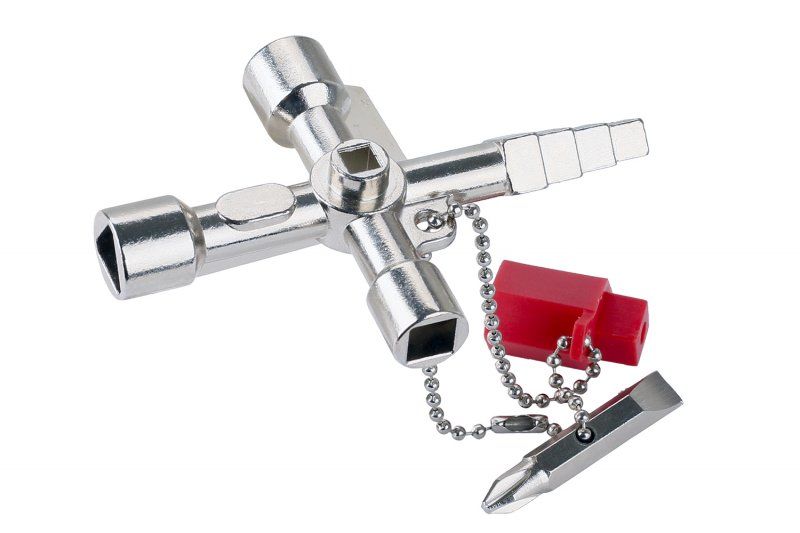 Univerzální klíč pro otevírání elektrických rozvaděčů, plynových a vodních kohoutů, pro klimatizaci, ventilaci a odvzdušňování topení. Vhodný také pro kliky oken či dveří a pro komínová dvířka. Doplněn o oboustranný bit plochý 1 x 7 mm / PH2.