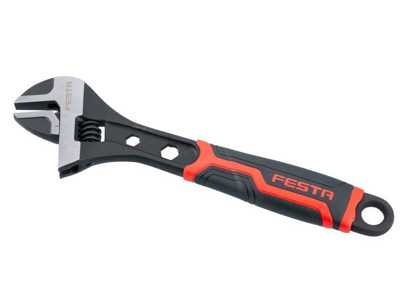 Stavitelný klíč FESTA 300 mm (12"). Kvalitní chromvanadiová ocel. Orientační milimetrová stupnice na pevné čelisti - nastavení rozsahu pro matice a šrouby max. 38 mm, přesný posuv a nastavení požadovaného rozměru. Ergonomická rukojeť z měkčené gumy pro pevný a neklouzavý úchop, očko pro zavěšení.