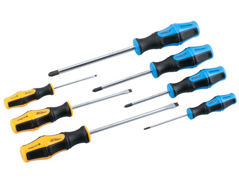 profesionální šroubováky určené pro průmyslové použití dřík vyroben z oceli S2 - ocel zušlechtěná legovacími prvky - chrom, křemík, mangan, molybden, vanadium magnetická kalená špička ergonomická zdravotně nezávadná dvoukomponentní rukojeť - neklouzavý a pohodlný úchop, otvor pro páku obsah sady - ploché 3x75, 5x100, 6x150 - PH 0, 1, 2, 3 typ a rozměry uvedeny v názvu výrobku