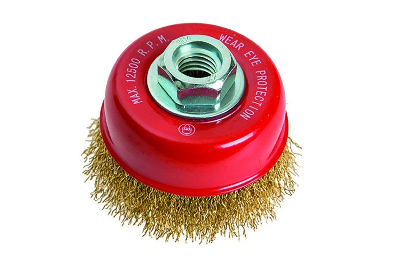 Kartáč miskový s mosaznými vlnitými drátky, uchycení M14, hrnkový, vhodné pro nerezové materiály.