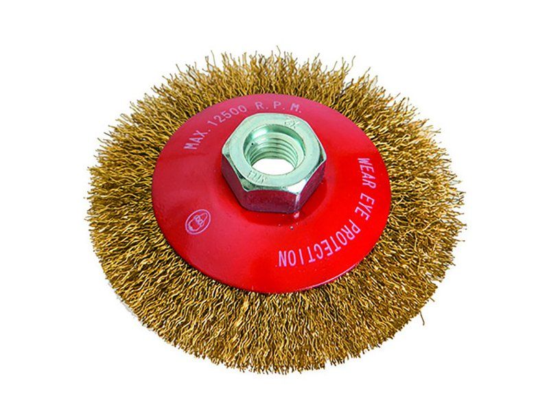 Kartáč miskový s mosaznými vlnitými drátky, uchycení M14, miskový, vhodné pro nerezové materiály.