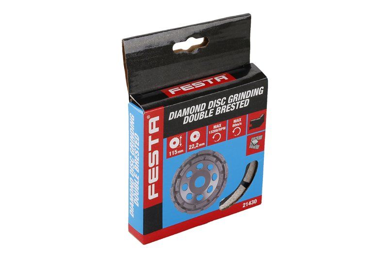 Brusný diamantový kotouč FESTA -dvouřadý, robustní nosný talíř je z pevné slitiny, speciální konstrukce uchycení diamantových segmentů k nosnému disku kotouče, vysoký obsah diamantového prachu v segmentech, použití: pro suché i mokré broušení mramoru, žuly, cihel, zdiva, přírodního i umělého kamene, obkladů, dlažeb, betonu..., tvar a provedení segmentů je vhodné pro hrubé a rchlé obrušování, rozměry: uvedeny v názvu výrobku, balení: papírový box s eurootvorem.