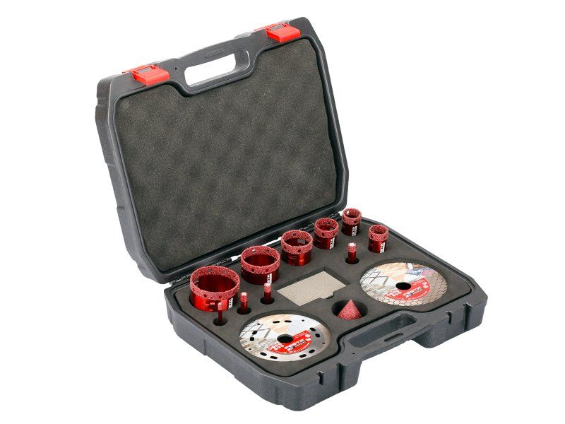 Speciálně sestavená sada diamantových nástrojů - vrtací, vykružovací, brusné korunky, řezné a brusné kotouče, brusná houba pro profesionální obkladačské práce. Diamantové korunky a kotouče pod značkou FESTA INDUSTRY rozšiřují řadu produktů určených zejména pro profesionální použití.