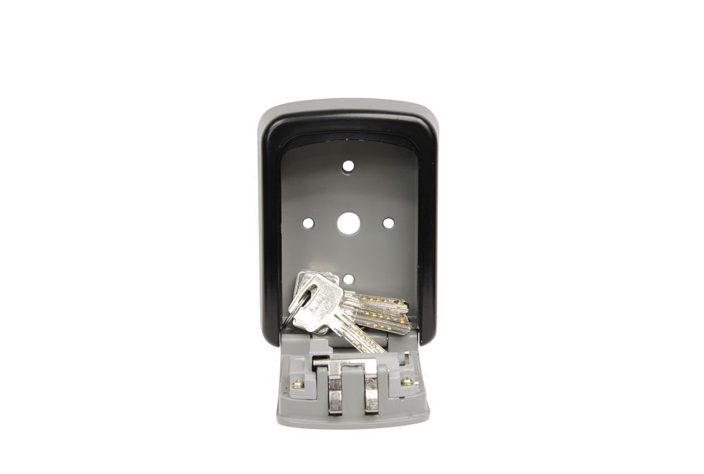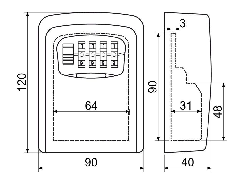 BEZPEČNOSTNÍ OCELOVÁ SCHRÁNKA (DEPOZIT) PRO ULOŽENÍ KLÍČŮ A KARET S MECHANICKÝM ZÁMKEM A KRYTEM Nastavení vlastní kombinace, kterou můžete kdykoliv změnit. 10.000 kombinací zámku. Určeno k fixaci na stěnu. Rozměr vnější š/v/h: 90 x 120 x 40 mm Rozměr vnitřní š/v/h: 64 x 90 (karta), 64 x 48 (klíče) x 31 mm Síla materiálu: 3 mm Hmotnost netto: 0,48 kg Balení vč. 4 ks šroubů a 4 ks hmoždinek. Barva: černo - šedá