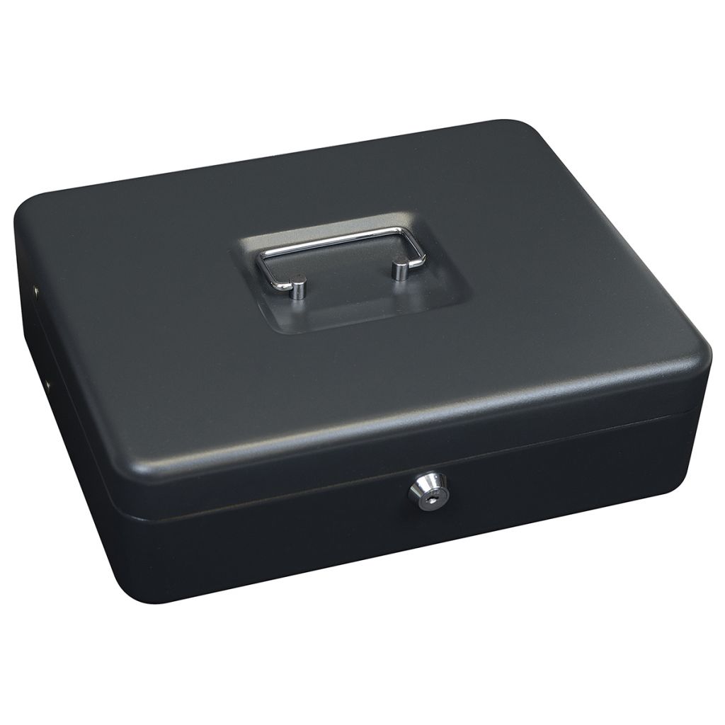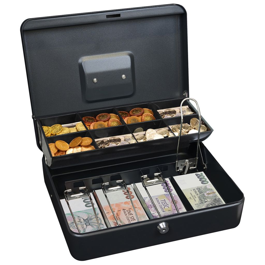 Ocelová pokladnička na bankovny a mince • Plastová vanička na kompletní řadu českých mincí • Fixace bankovek pomocí ocelového klipu na pružině • Balení včetně 2 ks klíčů Hmotnost netto: 2,1 kg Barva: matná černá