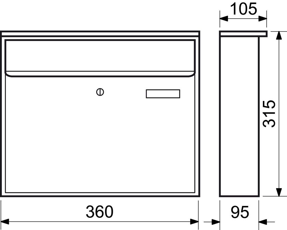 Nerezová schránka. Rozměr š/v/h: 360 x 315 x 95 mm Rozměr vhozu š/v: 315 x 30 mm Síla materiálu: 0,5 mm Hmotnost netto: 1,9 kg Balení vč. mont. materiálu a 2 ks klíčů. Barva: nerez (N)