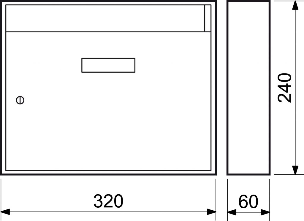 Ocelová schránka vhodná pro použití i do sestav. Rozměr š/v/h: 320 x 240 x 60 mm. Rozměr vhozu š/v: 294 x 21 mm. Síla materiálu: 0,7 mm. Hmotnost netto: 1,3 kg. Balení vč. mont. materiálu a 2 ks klíčů. Barva: stříbrná - S (flash silver).