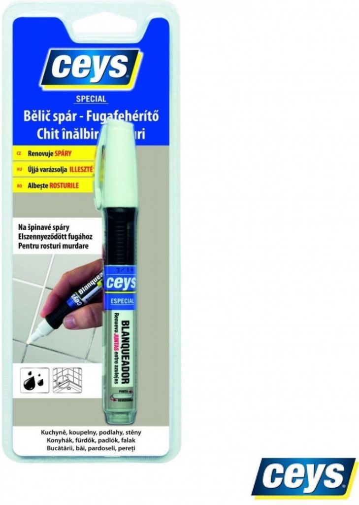 CEYS bělič spár obnovuje spáry mezi dlaždičkami v kuchyni a koupelnách i dlažbou na podlaze. Obsahuje speciální antibakteriální účinné látky, které zabraňují tvorbě plísní. Bělič je vybaven protiskluzným držákem a oboustrannou špičku, která prodlouží životnost jeho použití.