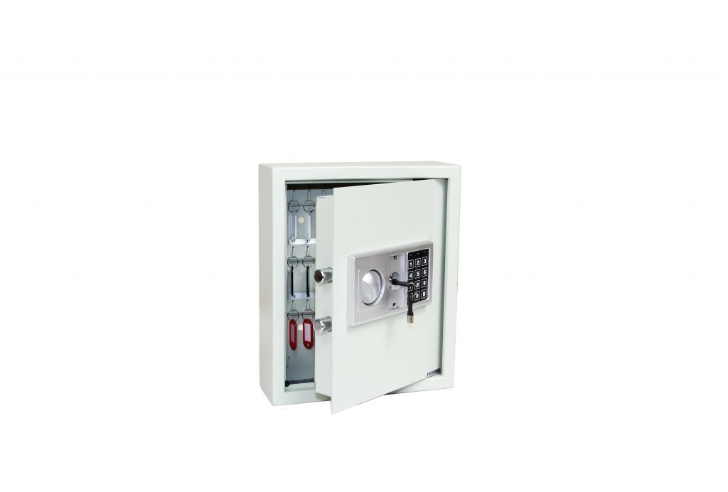 Ocelový sejf na klíce - 48 háku. Elektronický zámek s možností nastavení MASTER kódu. Výškove nastavitelné lišty s háky na klíce. Barevné jmenovky s kroužky na klíce. Rozmer š/v/h: 300 x 360 x 100 mm Hmotnost netto: 8 kg Síla materiálu: dvere 4 mm, plášt 1,5 mm Balení vc. baterií, mont. materiálu a 2 ks nouzových klícu. Barva: slonová kost (RAL 7035)