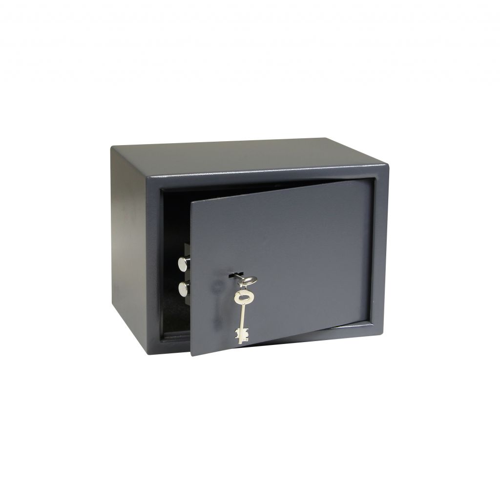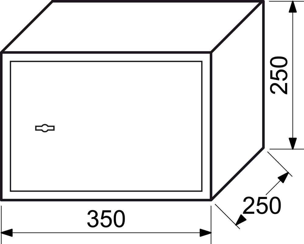 Ocelový sejf s mechanickým zámkem. Rozměr vnější š/v/h: 350 x 250 x 250 mm Rozměr vnitřní š/v/h: 346 x 246 x 190 mm Hmotnost netto: 8,6 kg Síla materiálu: dveře 4 mm, plášť 2 mm Barva: šedá Možnost ukotvení do zdi nebo podlahy. Balení vč. ocelových hmoždinek, šroubů a 2 ks klíčů. Objem: 16 l