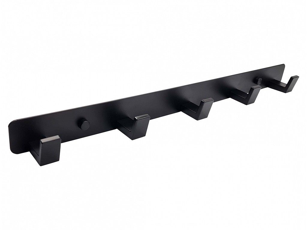 Kovový věšák na kovové liště. Povrchová úprava leštěný černý mat. Varianta s 5 věšáky. Šrouby pro uchycení jsou na hlavičce opatřeny závitem, na který se pevně našroubuje krytka pro zakrytí šroubu.