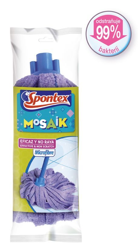 Náhradní hlavice k mopu Spontex Mosaik. Třásňový mop s extra účinnou technologií díky kombinaci mikrovlákna a polyesteru. Výměna náhrady je jednoduchá, zvládnete ji během chviličky. Návlek můžete bez obav prát v pračce na 60 °C, vyhněte se ale použití aviváže.