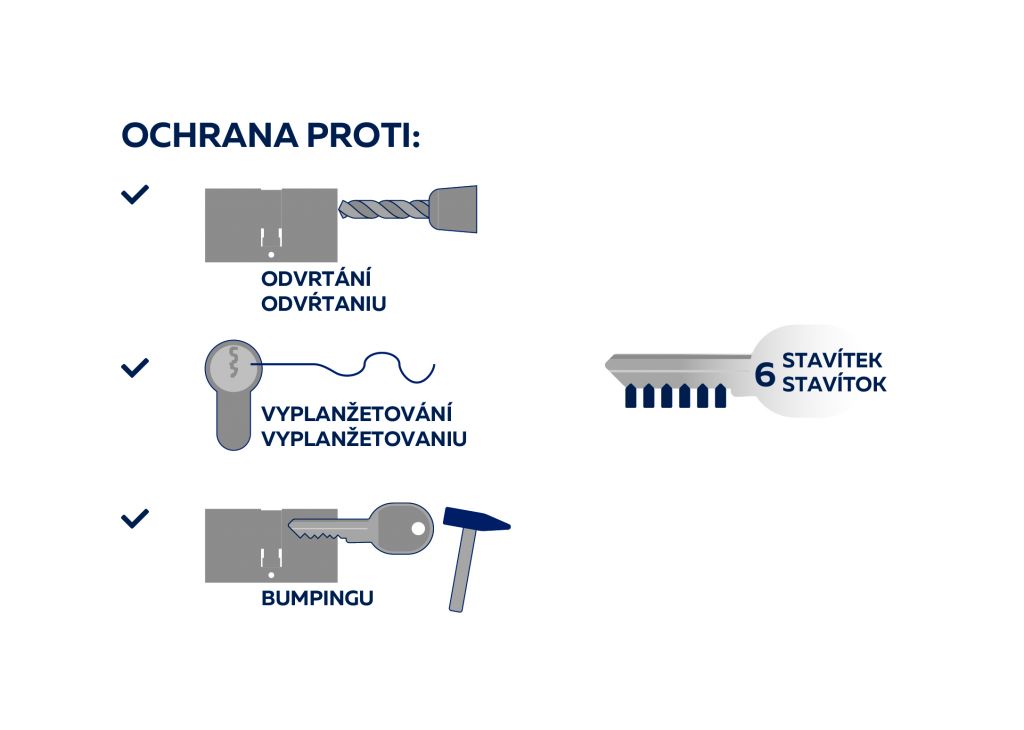 SET 3 KS CYLINDRICKÝCH VLOŽEK NA SU - SPOLEČNÝ UZÁVĚR • Certifikováno v bezpečnostní třídě RC3 dle ČSN EN 1627 • Certifikát NBÚ typ 2 SS4=2 • Bezpečnostní 6stavítková vložka s ochranou proti odvrtání, bumpingu a vyplanžetování (nový bezpečnější profil vložky) • 42.370 reálných kombinací klíče Vložka je vyráběna v provedení: oboustranná • Volně kopírovatelný klíč. Materiál vložky a klíčů: mosaz Povrch: matný nikl (NI) Balení obsahuje: 9 ks prodloužených klíčů 6 ks šroubů 50+60 mm identifikační kartu
