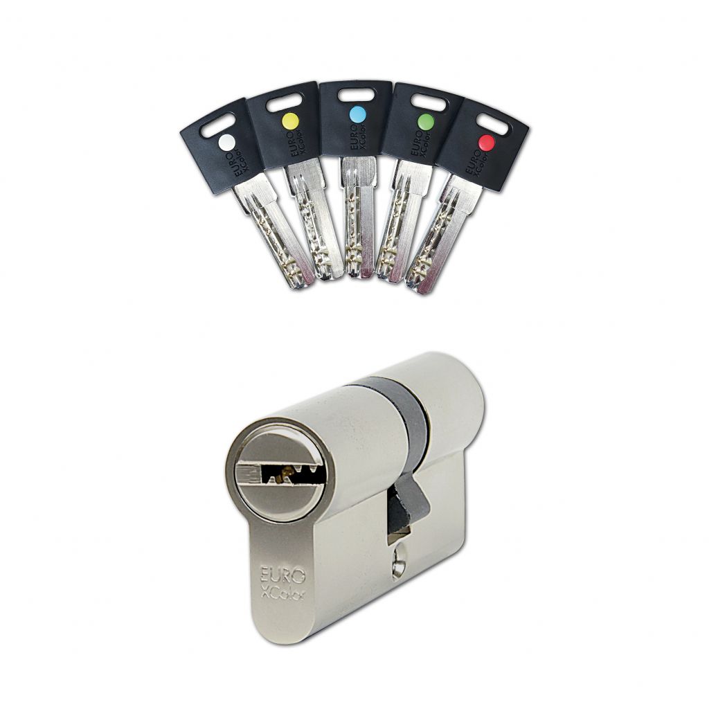 STAVEBNÍ 6STAVÍTKOVÁ VLOŽKA EURO XCOLOR Oboustranný důlkový klíč s plastovou hlavou a barevným pinem pro snadné rozlišení Certifikováno dle EN 1303-2015 Průmyslový vzor hlavy klíče Příslušné klíče každé vložky obsahují vždy 5 různých barev pinů: červená (CRV), modrá (MOD), zelená (ZEL), žlutá (ZLU), bílá (BIL) Vložka „30/35“ je navíc v nabídce se shodnými barvami pinů Materiál vložky a klíčů: mosaz Povrchová úprava: matný nikl (NI) Volně kopírovatelný klíč Balení obsahuje: 5 ks klíčů, 2 ks šroubů 50 + 60 mm
