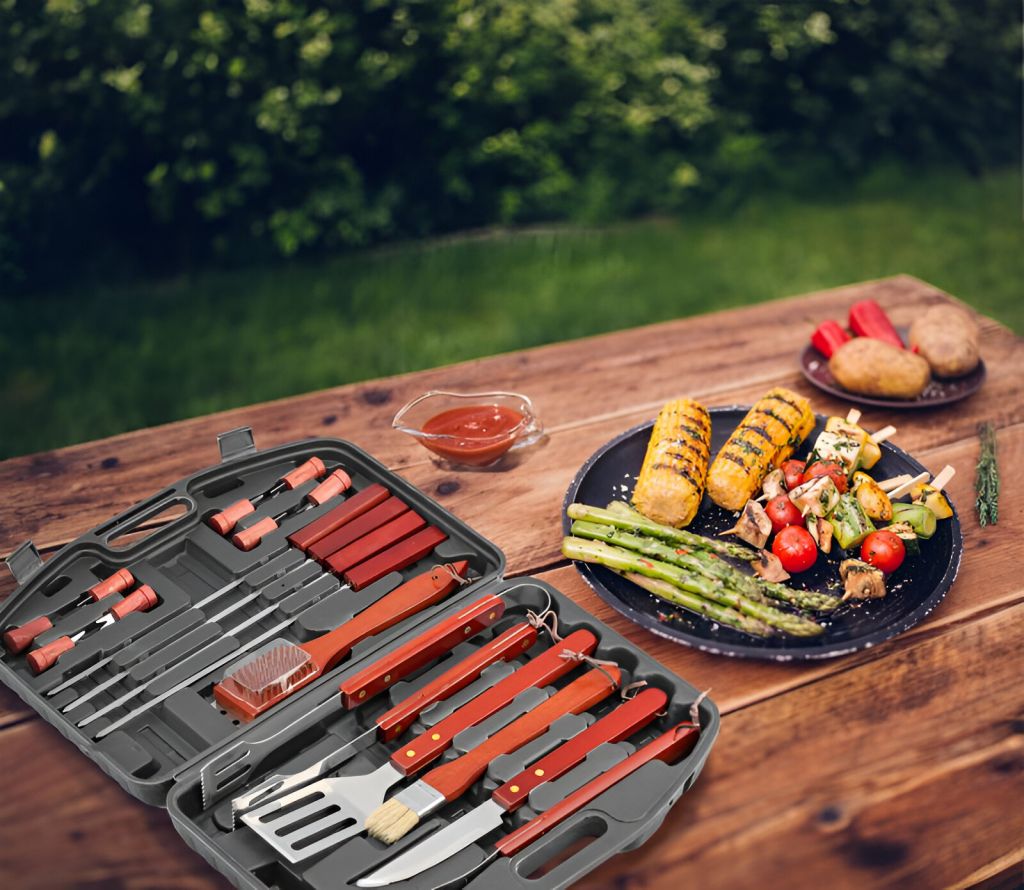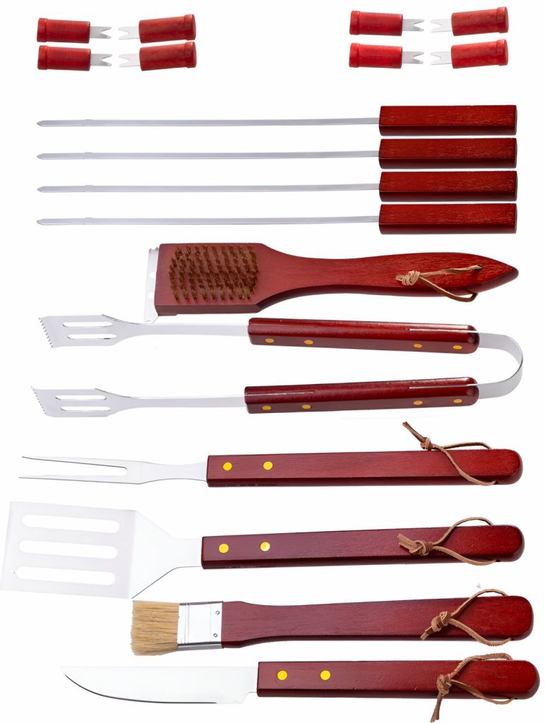Sada 19 ks grilovacího náčiní, vyrobené z nerezavějící oceli a dřeva. Obsahuje: obracečku, kleště, kartáč na čištění, 4x grilovací jehlu, vidličku, mašlovačku, dlouhý nůž, 8x držák na kukuřici. Baleno v plastovém kufru.