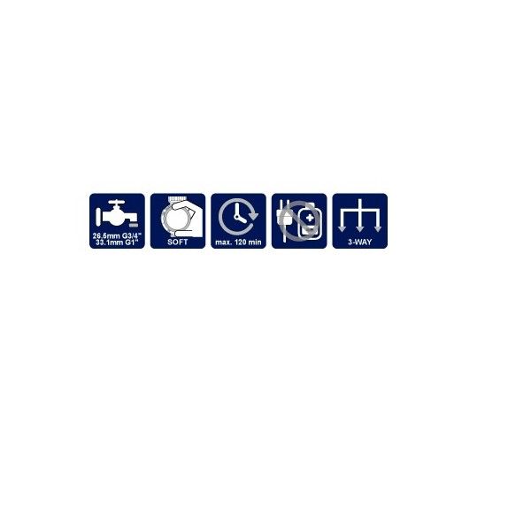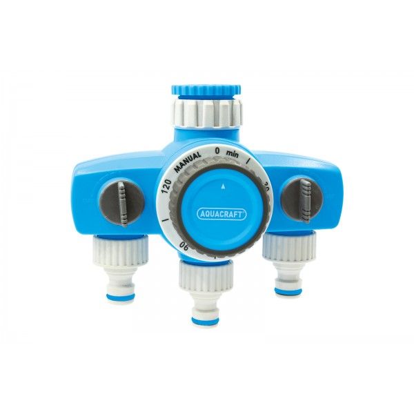 Mechanický časovač AquaCraft - max. 6 bar, 120 min, 290030 - nezávislé zavlažovací kanály na víceúčelové použití. Doba zavlažování od 15 do 120 minut. Spínače pokryté protiskluzovou gumou pro pohodlné a jednoduché používání. Nejsou potřebné žádné baterie. Pro kohoutky s (3/4" nebo 1") 26.5 mm nebo 33.1 mm závitem.
