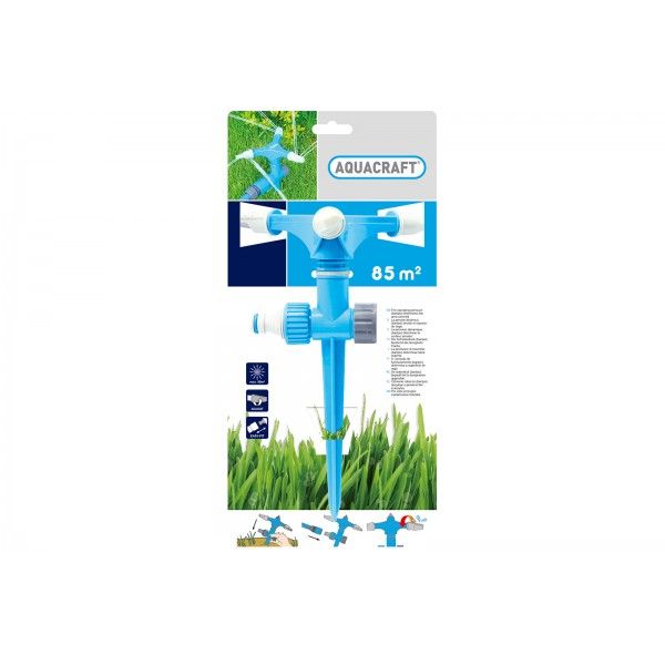 Hrotový rotační zavlažovač AquaCraft 260160 - vyroben z pevného plastu, 3 ramena zabezpečují kruhové zavlažování, plastový hrot na bezpečné zakotvení do trávniku.